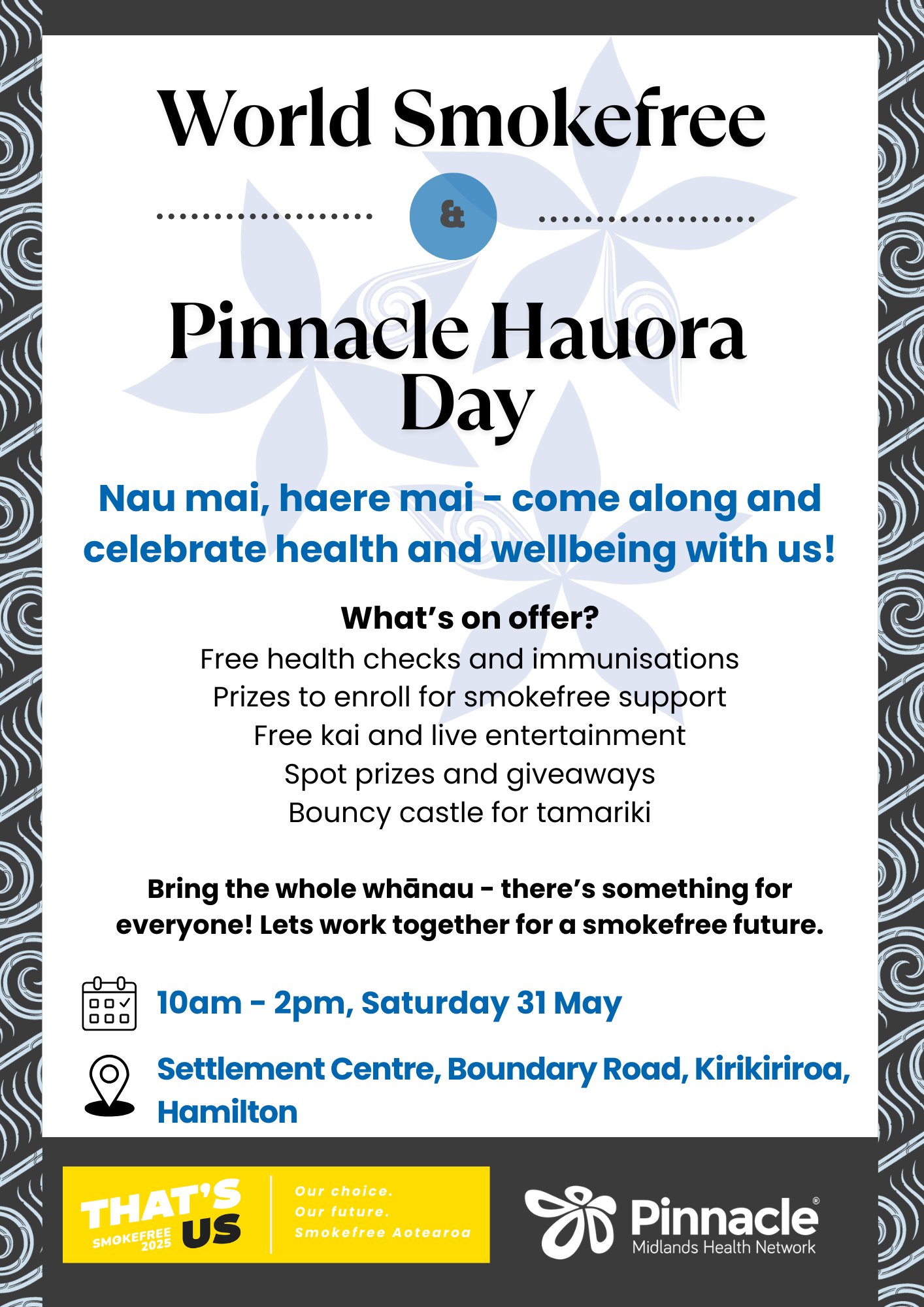 Nau mai, haere mai - come along and celebrate health and wellbeing with us! Bring the whole whānau - theres something for everyone! Let's work together for a smokefree future.